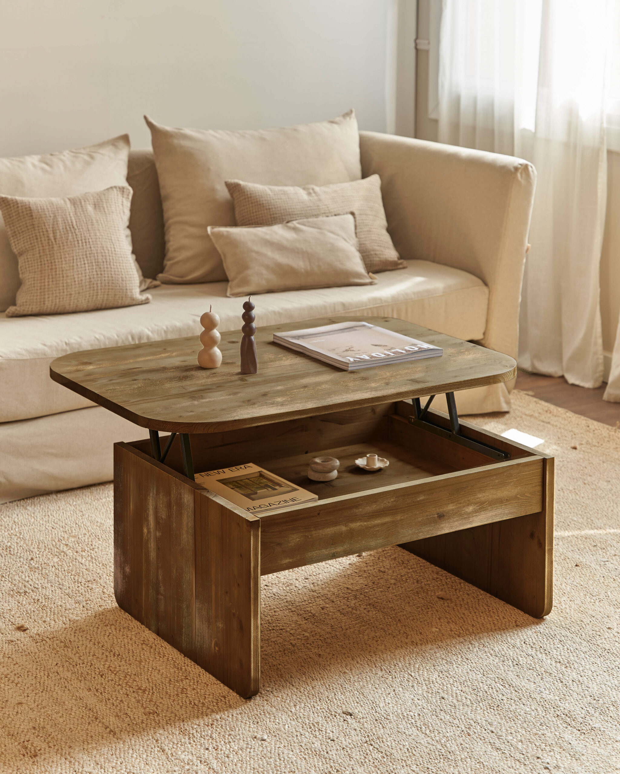 Le mécanisme de levage de Palmira vous permet de soulever le plateau avec les deux mains, transformant la table en une surface multifonctionnelle idéale pour travailler confortablement depuis le canapé ou pour profiter d’un repas informel avec une petite nappe. De plus, Palmira dispose d’un tiroir de rangement intérieur, offrant un espace supplémentaire pour organiser et ranger des objets comme des télécommandes, des magazines ou d’autres petits éléments que vous souhaitez garder à portée de main.